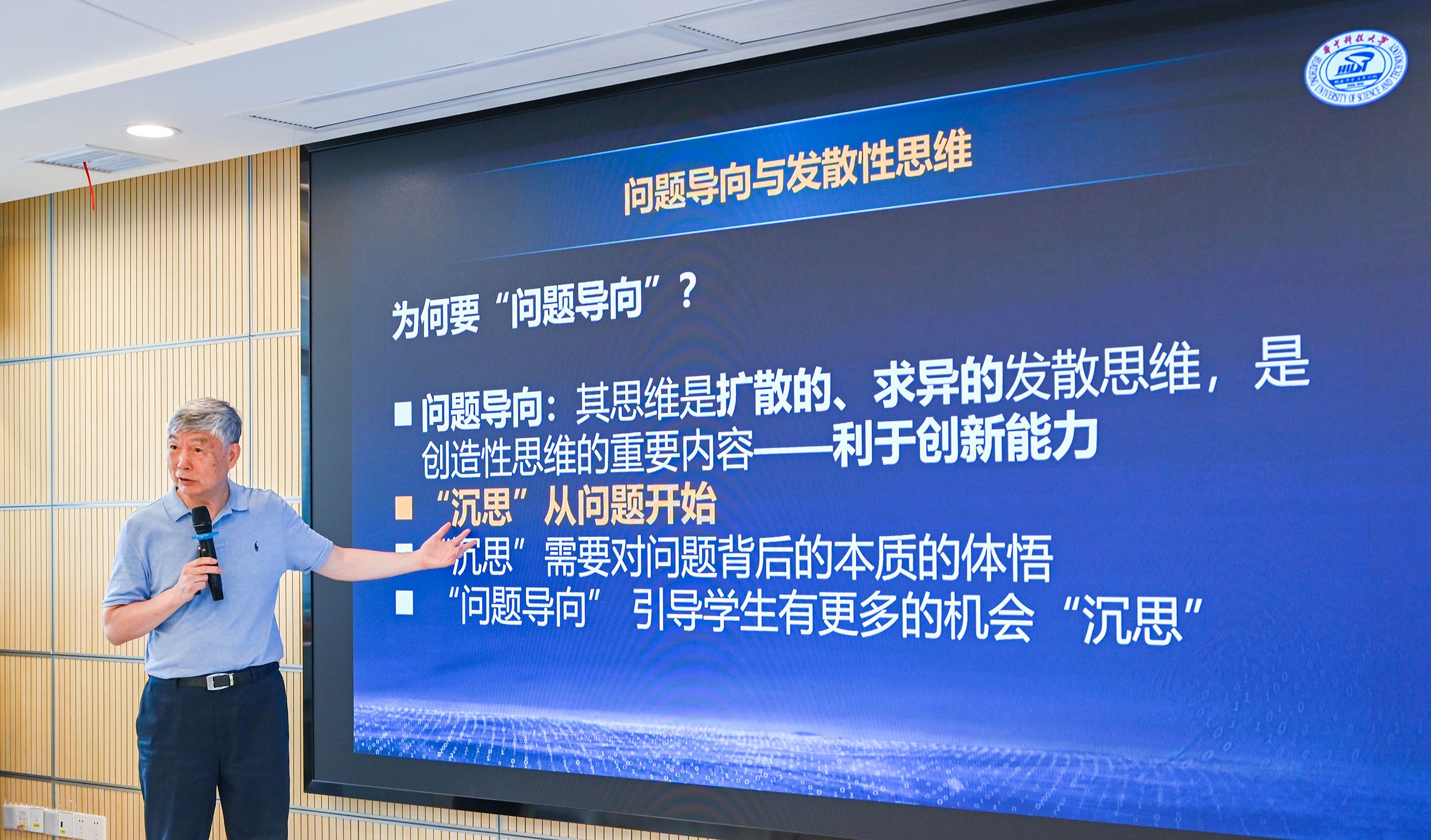 在授课环节,李培根以“教育还要有点新味道”为题,从AI技术飞速发展的热门话题引入,结合当下产业变革趋势,指出当今潮流下教育应增添创新“味道”,鼓励同学们从问题导向出发,主动观察生活、深度沉思现象、大胆质疑常规、自由展开想象,着力培养创造性思维,并以兴趣驱动个性化发展,树立从实践中探索真知的认识观。
