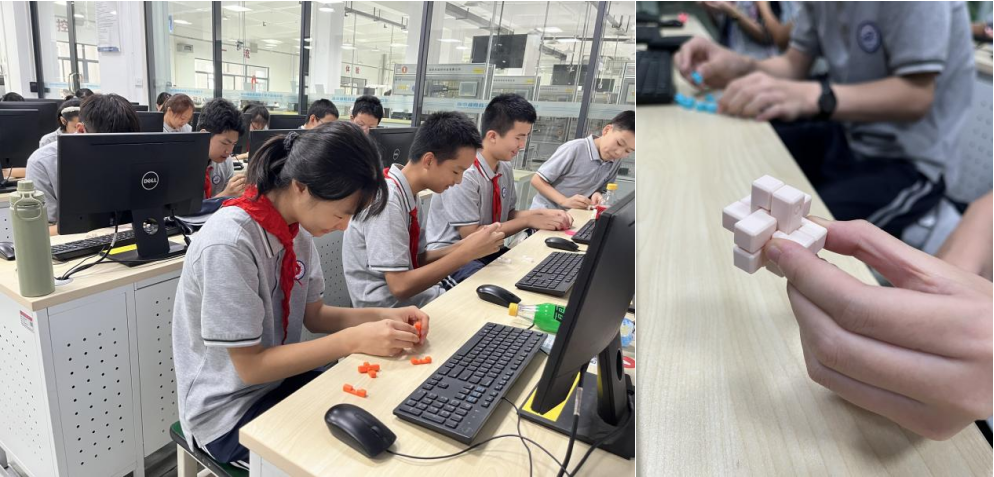 在3D打印项目区,同学们挑战复刻精巧的鲁班锁。从三维模型设计到独立操作打印机,亲眼见证了数字模型被逐层构筑为实体构件的过程。当亲手打印、组装的鲁班锁严丝合缝地拼装成功时,传统工艺与现代科技的碰撞,极大地激发了同学们对先进制造技术的探索欲。