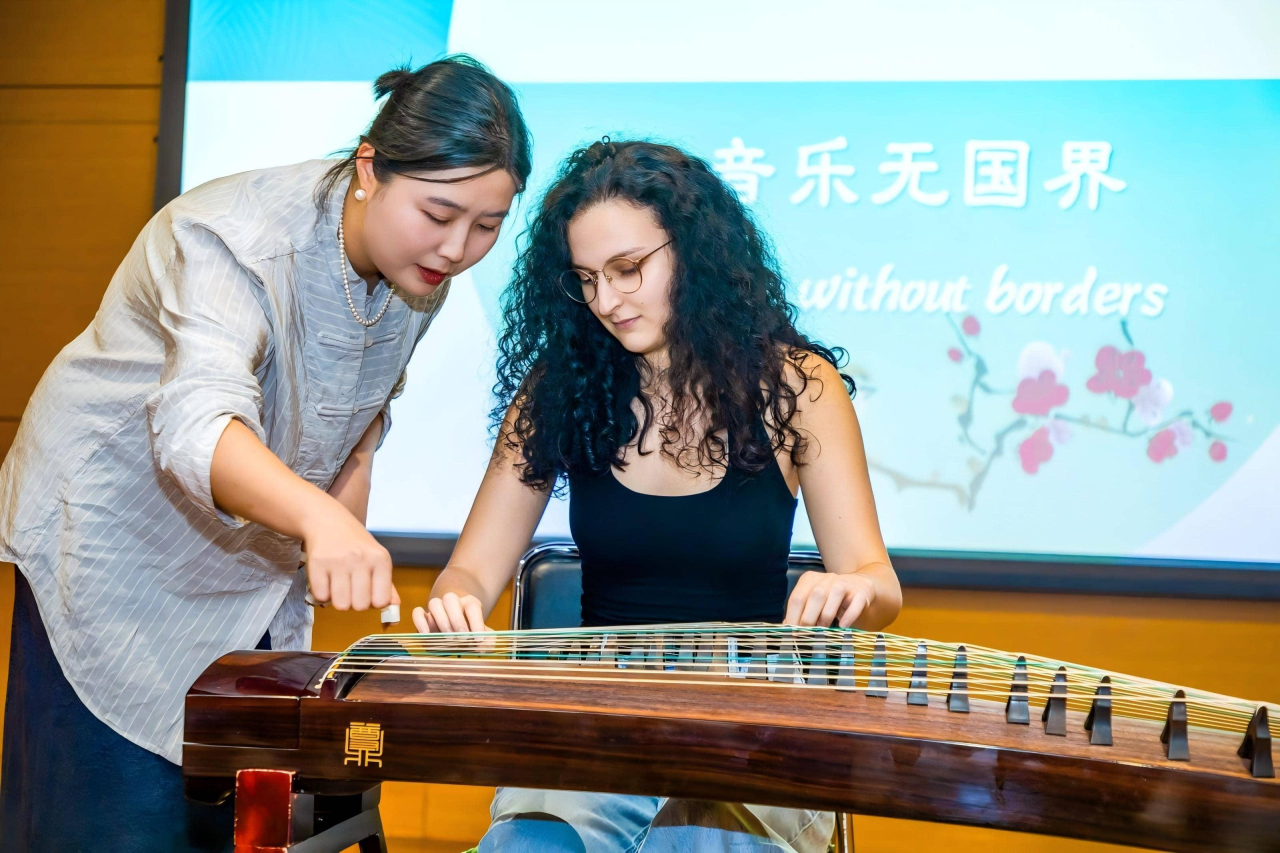 在乐器分类讲解环节,李雅师介绍了民族器乐四大家族——吹管乐器、弹拨乐器、拉弦乐器与击奏乐器。她展示了笛箫、古筝、扬琴、二胡等实物乐器。艺术学院学生现场演绎经典曲目,掌声不断。“接下来,我想用一首《出水莲》,带大家感受中国古筝十大名曲之一里‘诗画交融’的意境。”指尖落下,古筝琴弦流淌出婉转悠扬的旋律。报告厅内瞬间安静下来,观众或侧耳倾听,或轻轻点头。乐器体验互动环节,李雅师邀请国际学生上台尝试演奏古筝。互动间,不同文化背景下的音乐认知悄然碰撞。
