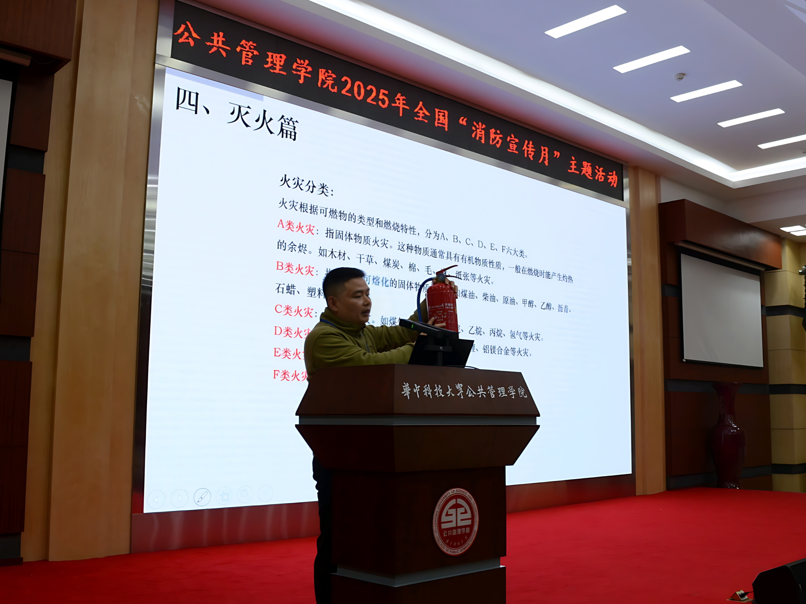 保卫处消防科副科长蒋卫东以“全民消防,生命至上——安全用火用电”为主题作专题报告。他强调消防安全的紧迫性与重要性,叮嘱大家牢记“预防为主、防消结合”的原则,增强风险意识;同时他还结合典型案例讲解防火常识和法律责任,重点提示寝室消防安全隐患,提醒同学们严禁使用违规电器、杜绝私拉乱接电线,共筑平安校园防线。