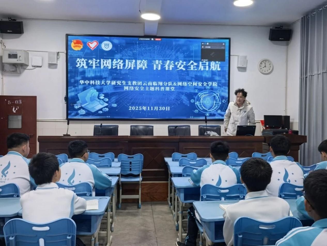 新闻网讯(通讯员 何姿霖 徐笛)11月30日晚,网安学院“网安中国”党员先锋队、本科生信息安全2401班团支部联合学校研究生支教团云南临翔分队,通过视频连线的方式为云南省临沧市临翔区第一中学初中部2000余名学生带来了一堂生动而深刻的网络安全科普课。