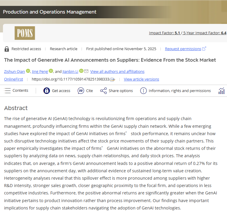 新闻网讯 近日,管理学院2021级博士研究生钱自顺(第一作者),导师李建斌教授(通讯作者)与美国康涅狄格大学彭景教授合作的研究成果“The Impact of Generative AI Announcements on Suppliers: Evidence From the Stock Market”在管理学UTD24顶级期刊Production and Operations Management(简称POMS)上发表。