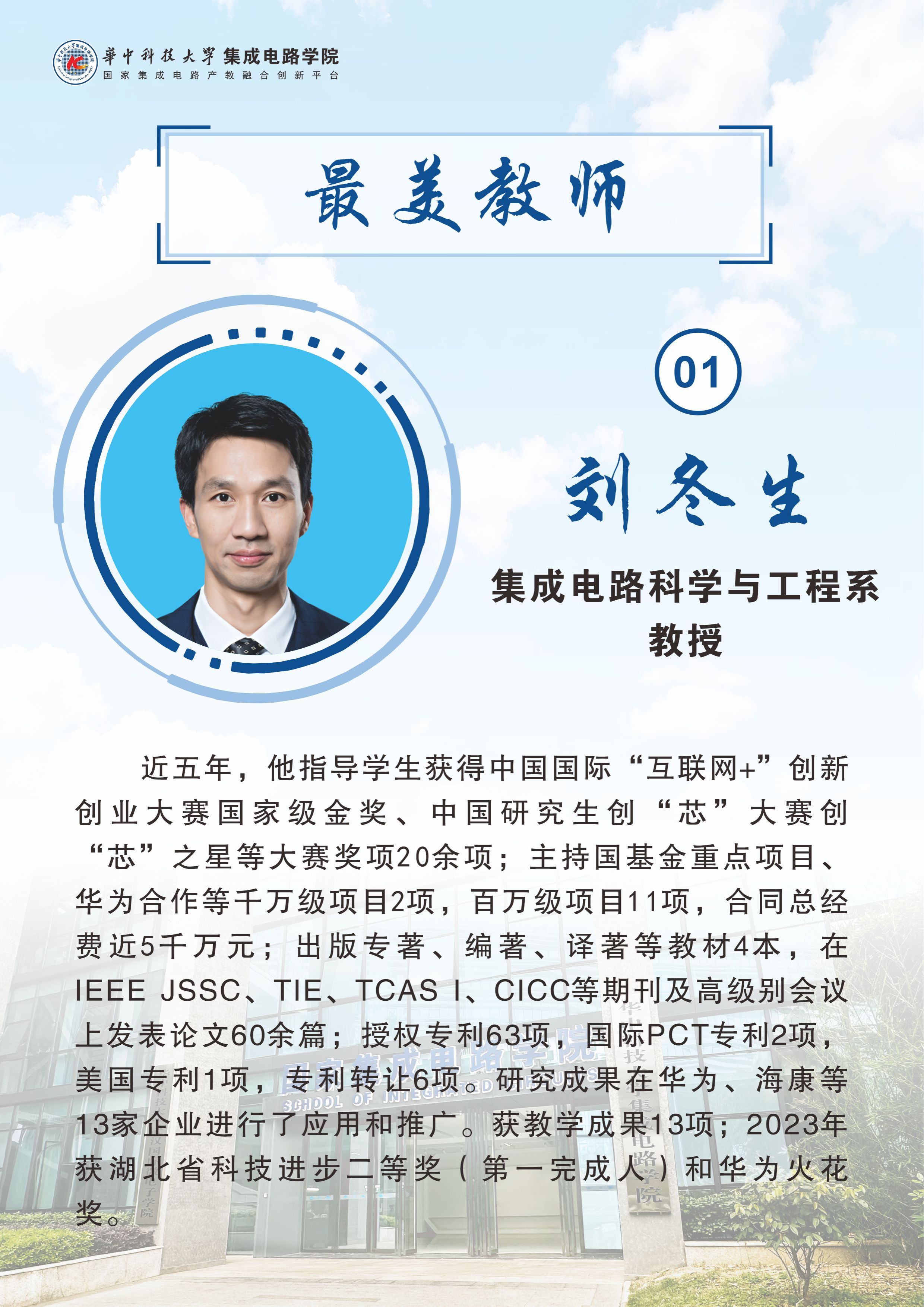 刘冬生现任集成电路科学与工程系主任,致力于专业育人与思政化人同向同行,出版专著、编著、译著等教材4本,主讲四门本科生课程和一门研究生课程,近5年累计授课748学时,共计1301人次选学,获教学成果17项;出版国际首部《后量子密码芯片设计》专著,被列为国家“集成电路系列丛书”;指导学生获得中国国际“互联网+”创新创业大赛国家级金奖、中国研究生创“芯”大赛最高奖创“芯”之星、全国大学生光电设计竞赛国家级一等奖等大赛奖项20余项。