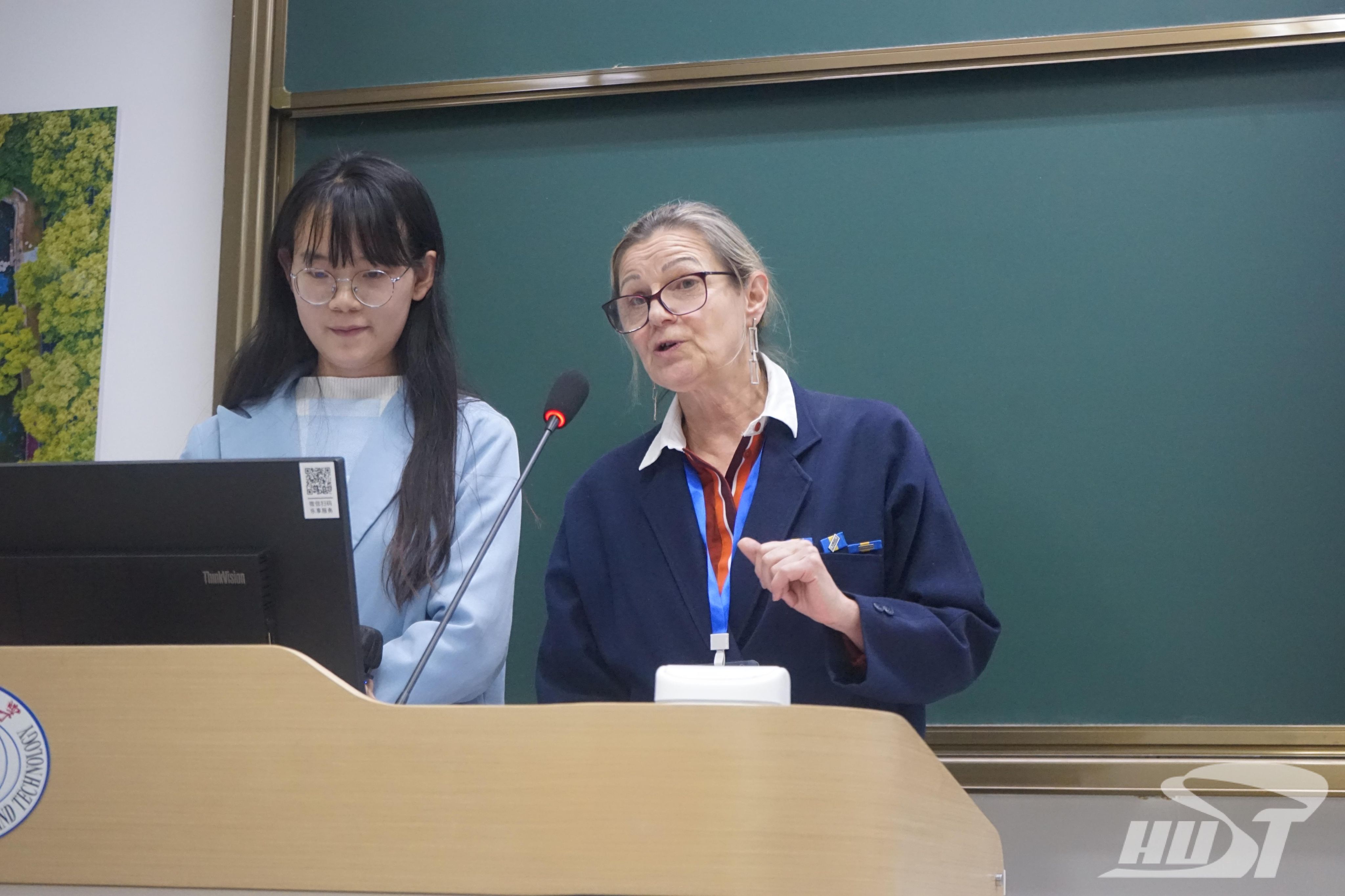 在互动环节,不少同学抓住跨国交流机会,基于自身专业内容进行提问:如学习德语临床医学的同学对德国政党政治表现出了浓厚的兴趣,而马院的同学则询问马克思主义在当今欧洲的发展状况。Doris综合欧洲状况,对这些问题进行了耐心而严谨的解答。在被问及“任务中印象最深刻的时刻”时,她向同学们讲述了转移民众的经历。受到提问同学的真诚赞美,她却表示:“优雅的不是我,而是那些在战火中也不愿意离开家园的人们。”