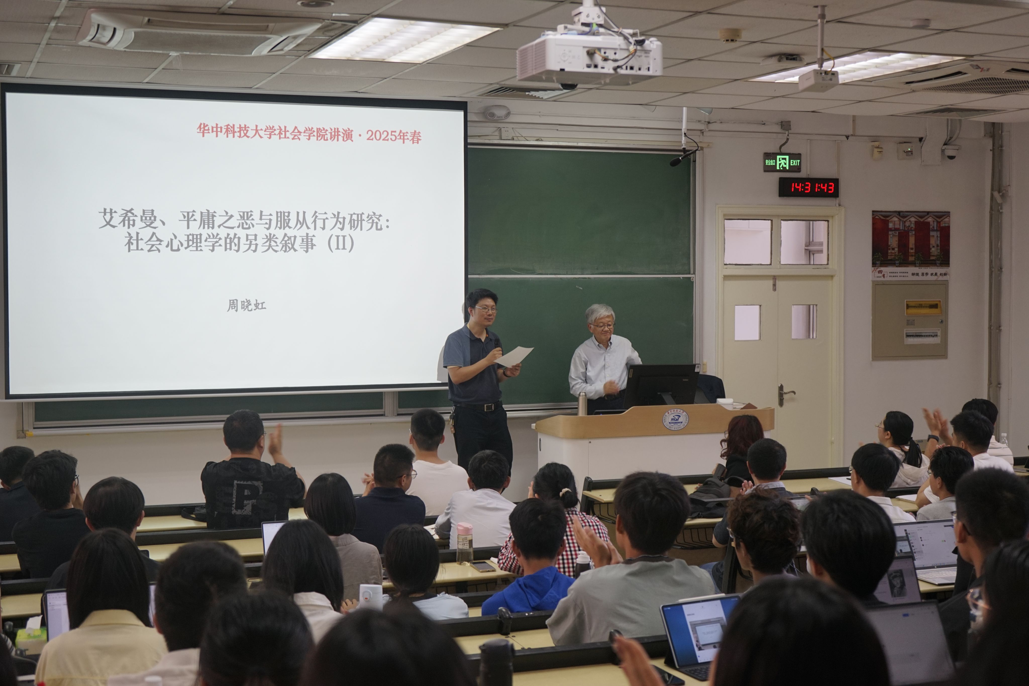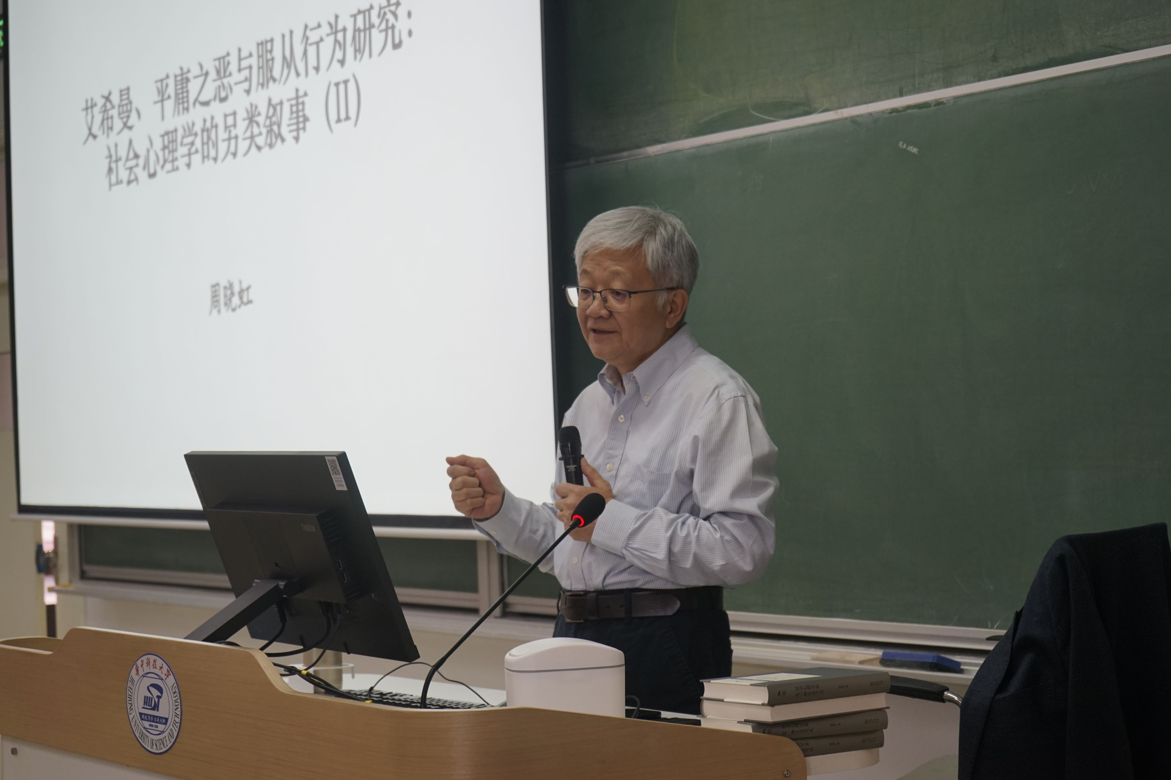 新闻网讯(通讯员 栾笑)5月12日,社会学院讲演、第2559期人文讲座在西十二楼S302举行。南京大学学术委员会副主任、国家社会科学基金学科规划评审组专家、中国社会心理学会会长、中国社会学会副会长、国务院社会学学科评议组成员周晓虹教授为师生作了题为“艾希曼、平庸之恶与服从行为研究——犹太创伤与社会心理学的另类叙事”的精彩讲座。讲座由社会学院院长狄金华教授主持。