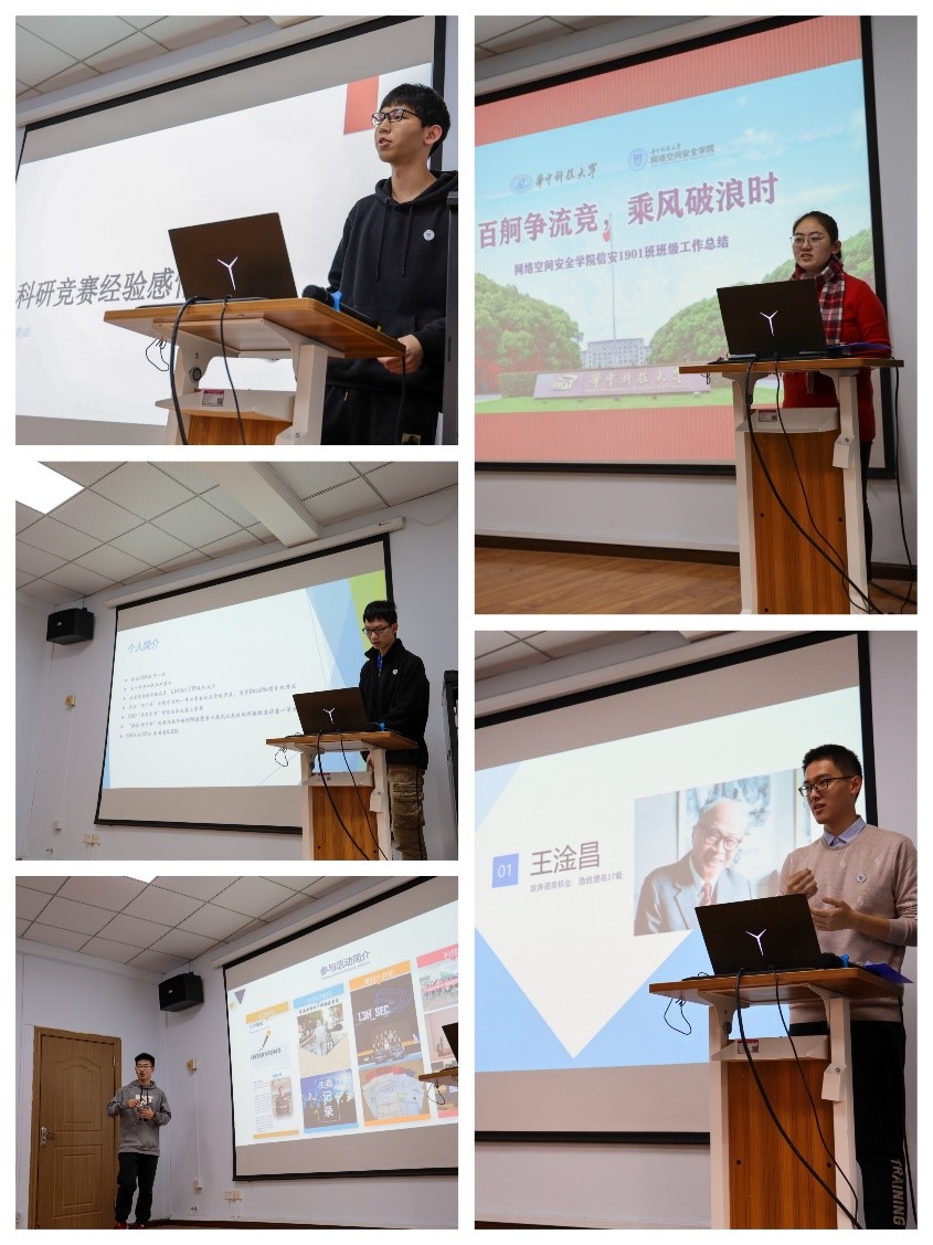 团支书陈淇棋首先汇报了信安1901班学理论抓实践出“正品”、学先进抓创新出“精品”、学标兵抓学习出“样品”——三学三抓出“三品”班级建设工作思路,班级同学在学业发展、科创竞赛、学生工作、二课活动等方面取得的成绩。沈奥成和尹一涵分享了自己参加科创竞赛的经验和体会。陈龙飞分享了学生工作带给自己的改变和收获。邱士煜通过分享王淦昌、王大珩、戴文渊、黄群四位科技工作者的故事,带领大家学习了习近平总书记在科学家座谈会上的讲话以及“习近平与大学生朋友们”系列报道(十一),号召同学们在实现网络强国梦的时代征途中书写青春华章。教师班主任羌卫中老师介绍了学校大学生创新创业项目政策和学院的大学生创新创业平台,鼓励同学们积极参与申报大创项目。