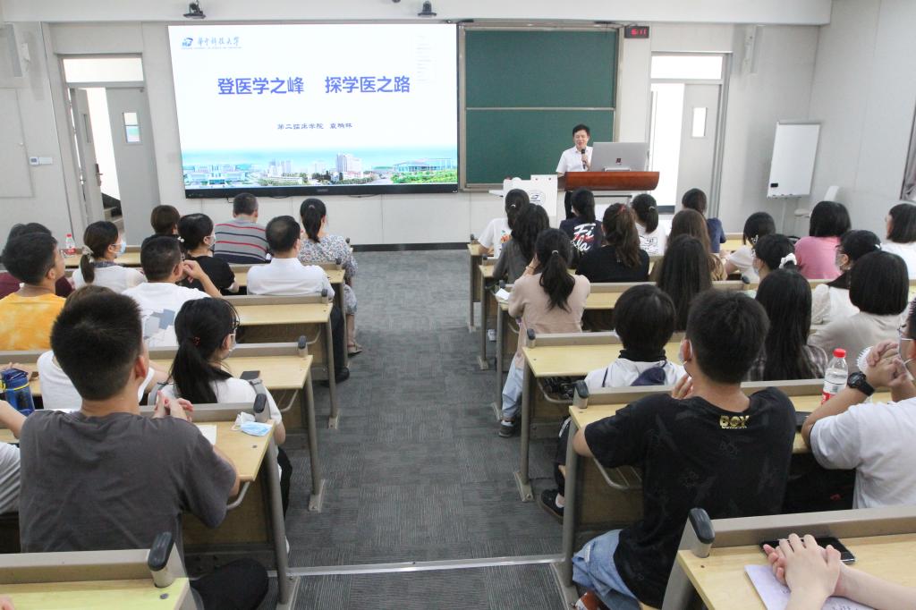副院长袁响林向同学们介绍了同济医学院的整体情况,讲述了同济的抗疫故事,提出了如何进行医学学习的宝贵建议;医学教务处副处长舒涛向八年制的同学提出了新学期的学习要求;教办副主任姚飞介绍了第二临床学院教学的整体情况;褚倩教授以“八年制——后半场如何度过?”为题,分享了医学生的就业现状和临床实习的要点,号召同学们广泛阅读文章,寻找兴趣点、科研方向和有创造力的团队,一起做好科研工作;学办副主任杨帆希望同学们从德、智、体、美、劳等各方面提升自己。